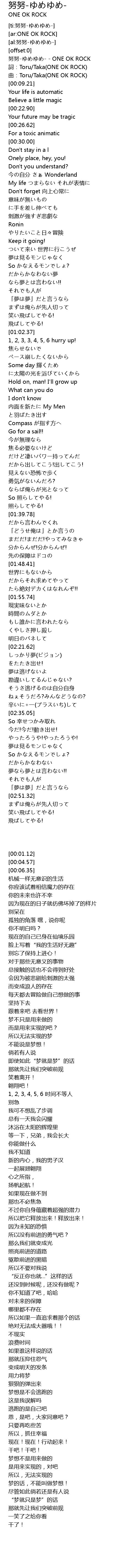 | [00:01.12] | 努努-ゆめゆめ- - ONE OK ROCK |