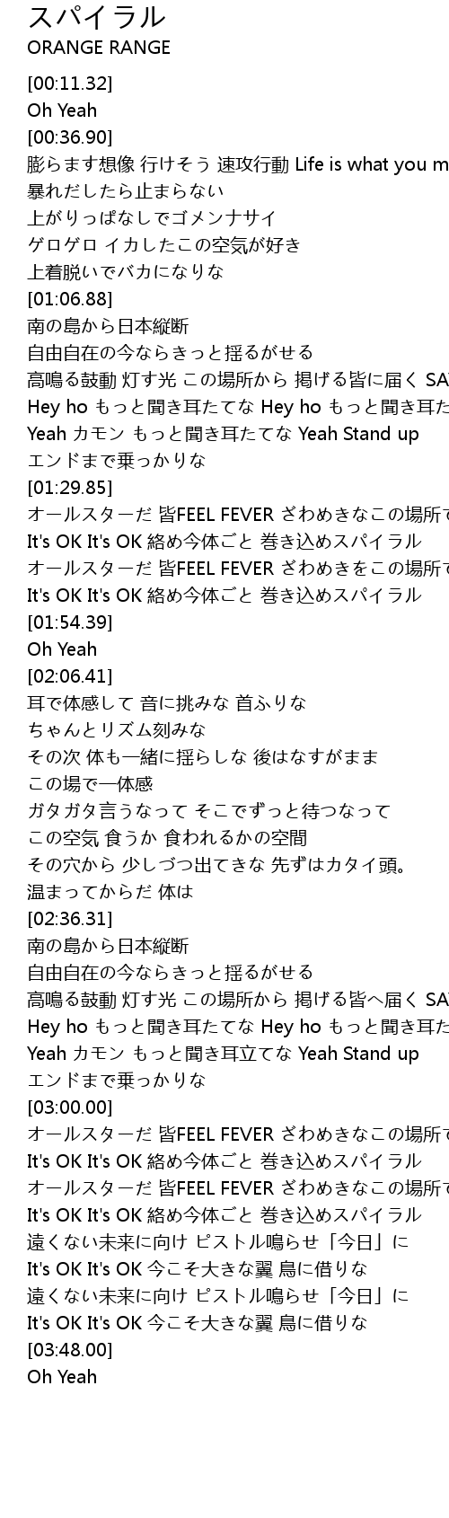 | [03:17.93] | It's OK It's OK 絡め今体ごと 巻き込めスパイラル |