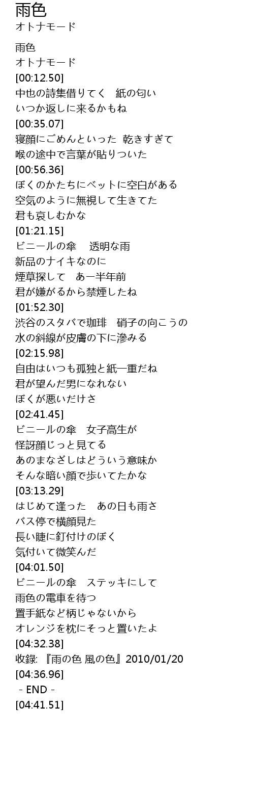 | [04:34.35] | 收錄: 『雨の色 風の色』2010/01/20 |