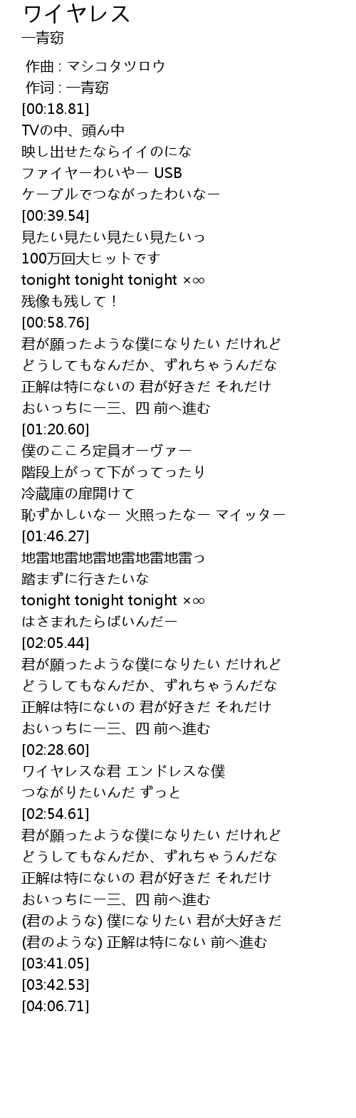 | [02:45.68] | ワイヤレスな君 エンドレスな僕 |