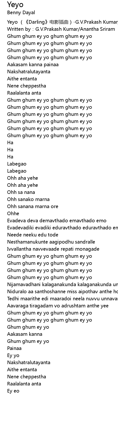 | [00:00.341] | Yeyo Darling diàn yǐng chā qǔ G. V. Prakash Kumar Benny Dayal |