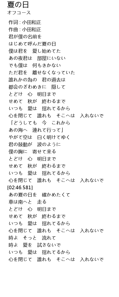 | [00:21.882] | はじめて呼んだ夏の日 |