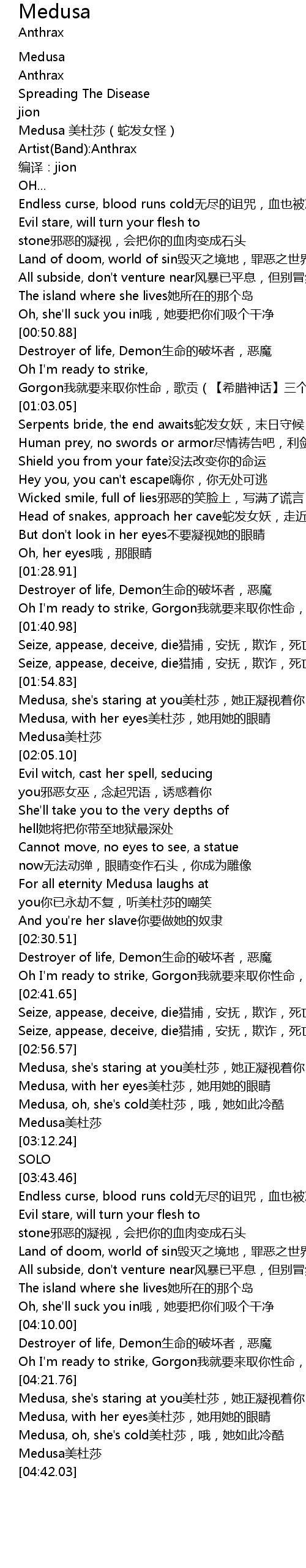 | [03:01.02] | Medusa, with her eyes měi dù shā, tā yòng tā de yǎn jīng |