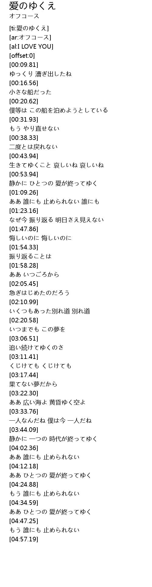 | [00:58.16] | 静かに ひとつの 愛が終ってゆく |