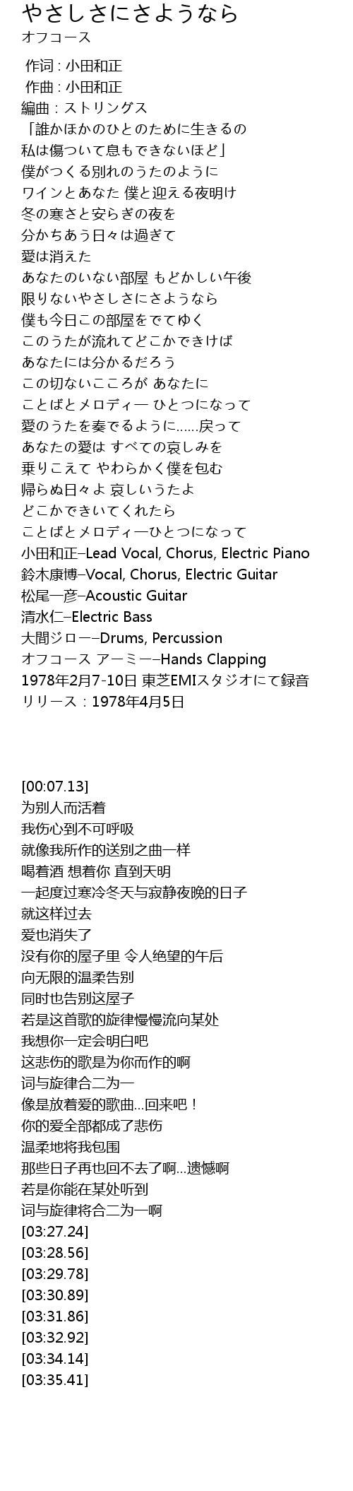 | [03:27.24] | 小田和正–Lead Vocal, Chorus, Electric Piano |