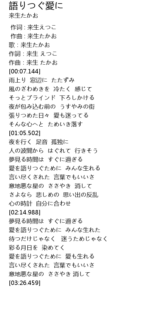 | [03:01.146] | 愛を語りつぐために 愛も生れる |