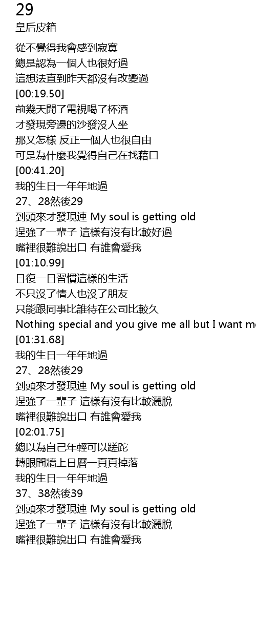 | [00:29.01] | 那又怎樣 反正一個人也很自由 |