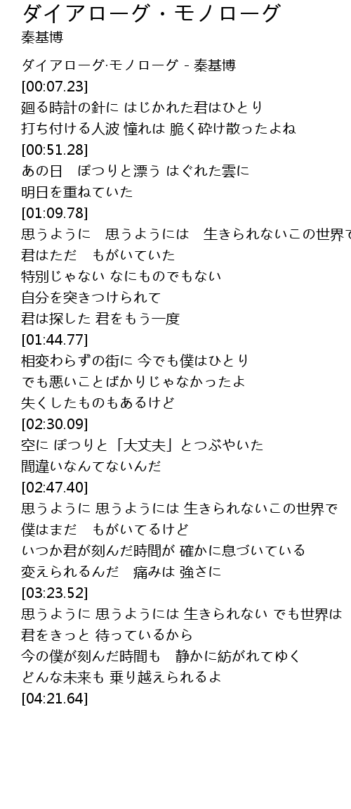 | [00:03.24] | ダイアローグ·モノローグ - 秦基博 |