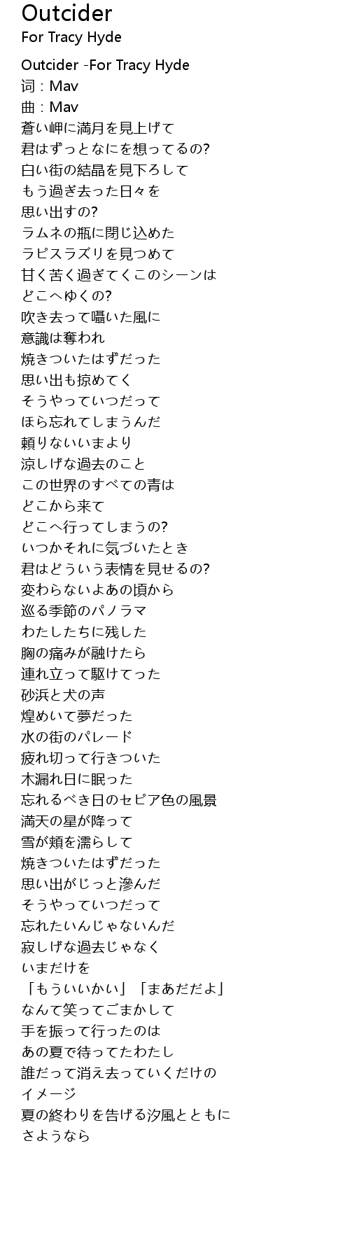 | [00:00.00] | Outcider -For Tracy Hyde |