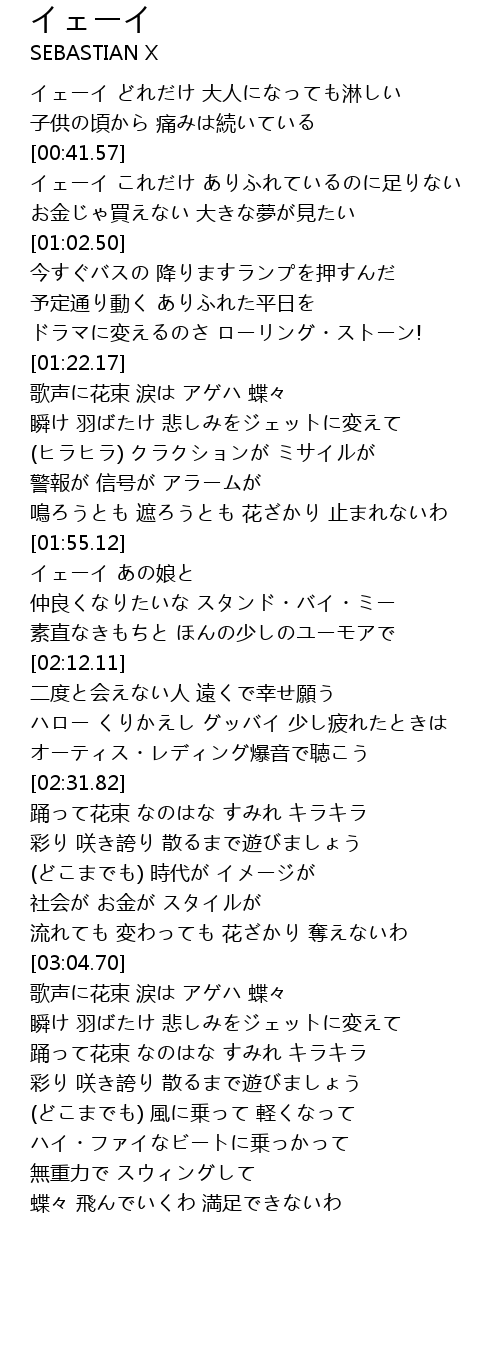| [01:22.63] | 歌声に花束 涙は アゲハ 蝶々 |