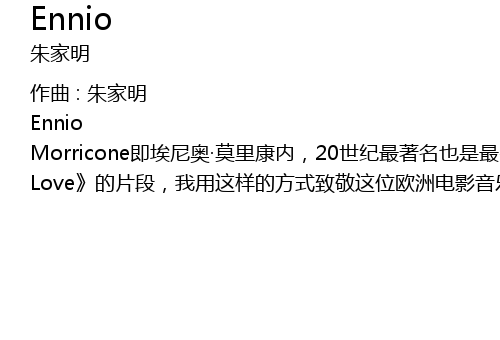 | Ennio Morricone即埃尼奥·莫里康内,20世纪最著名也是最多产的电影配乐大师,与尼诺·罗塔并誉为“欧洲电影音乐领航者”。1928年生于罗马,毕业于著名的圣切契里亚音乐学院,迄今为止已经参与制作了各国电影配乐作品400多部,是意大利最多产、最有建树的作曲家。他的音乐涉及的领域出人意料地繁杂,包括古典、爵士、流行、摇滚、电子、先锋乐派、意大利民族音乐等等。我一直想写一首偏古典的音乐作品向这位电影配乐大师致敬,大家可以听到我在乐曲中用了一段电影“海上钢琴师”中《Playing Love》的片段,我用这样的方式致敬这位欧洲电影音乐巨人。 |