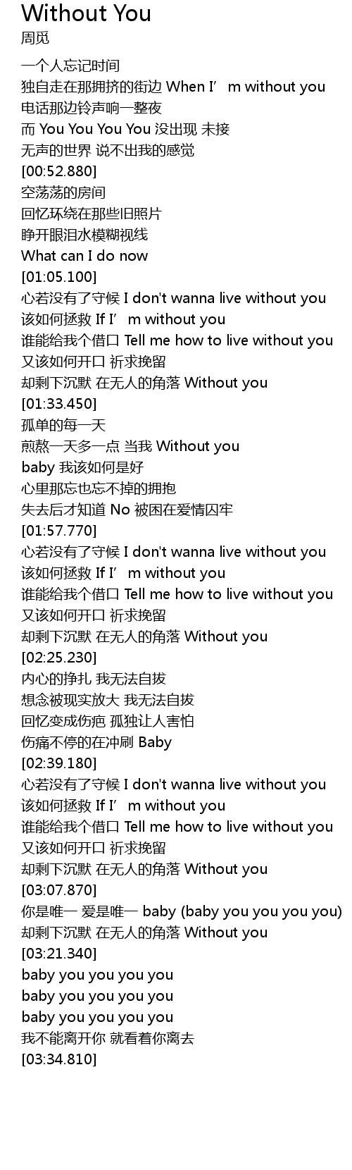| [03:17.530] | 却剩下沉默 在无人的角落 Without you |
