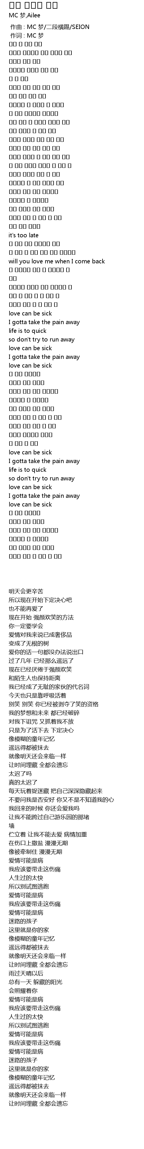| [01:40.420] | 세워지고 사랑을 못해 심해지는 병 |