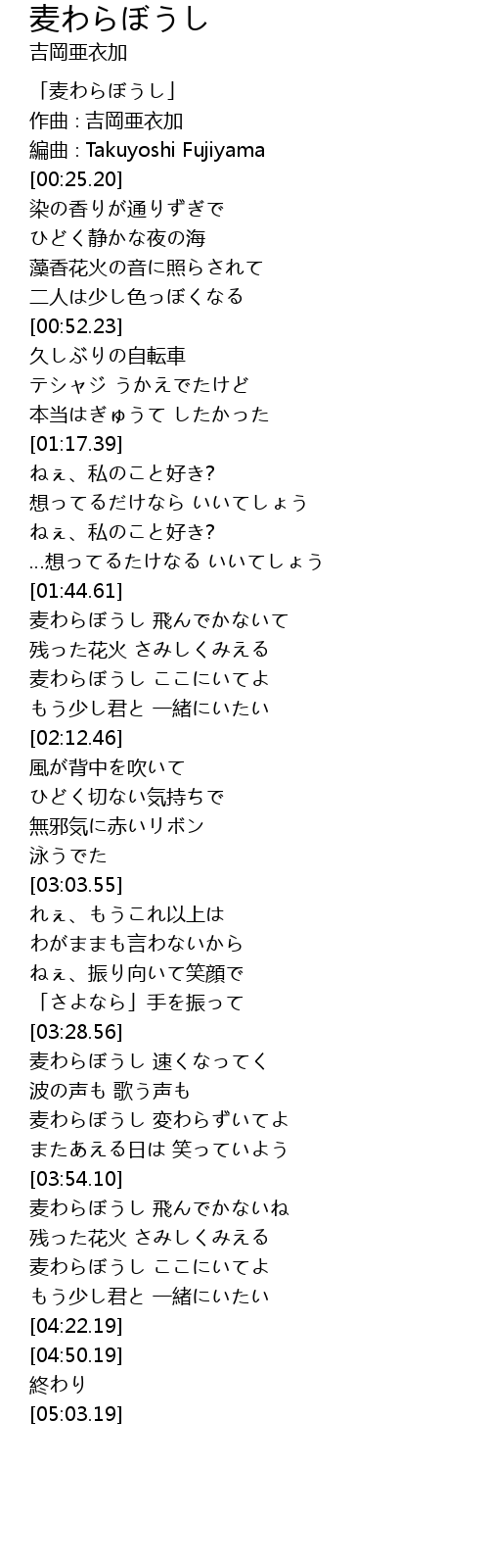 | [03:41.95] | 麦わらぼうし 変わらずいてよ |