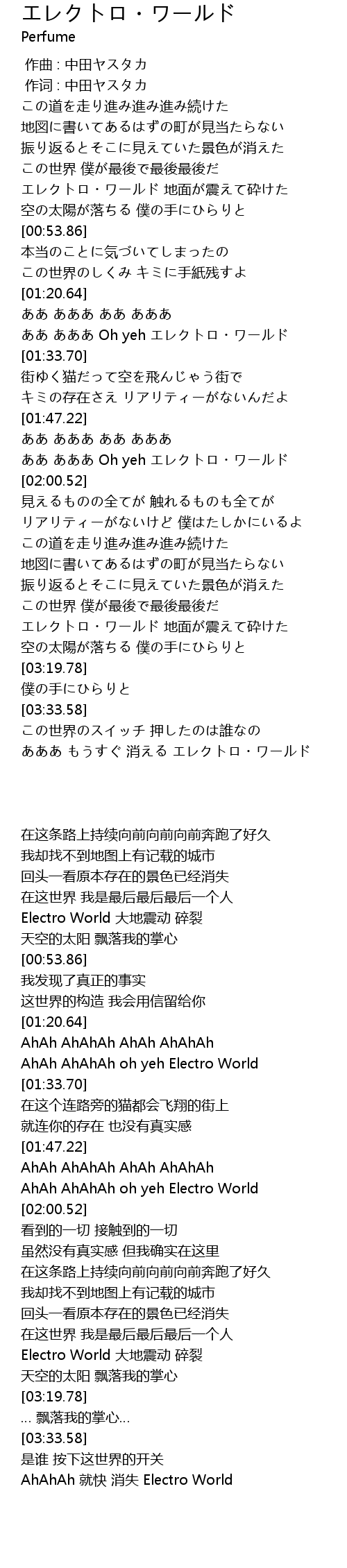 | [01:54.88] | AhAh AhAhAh oh yeh Electro World |