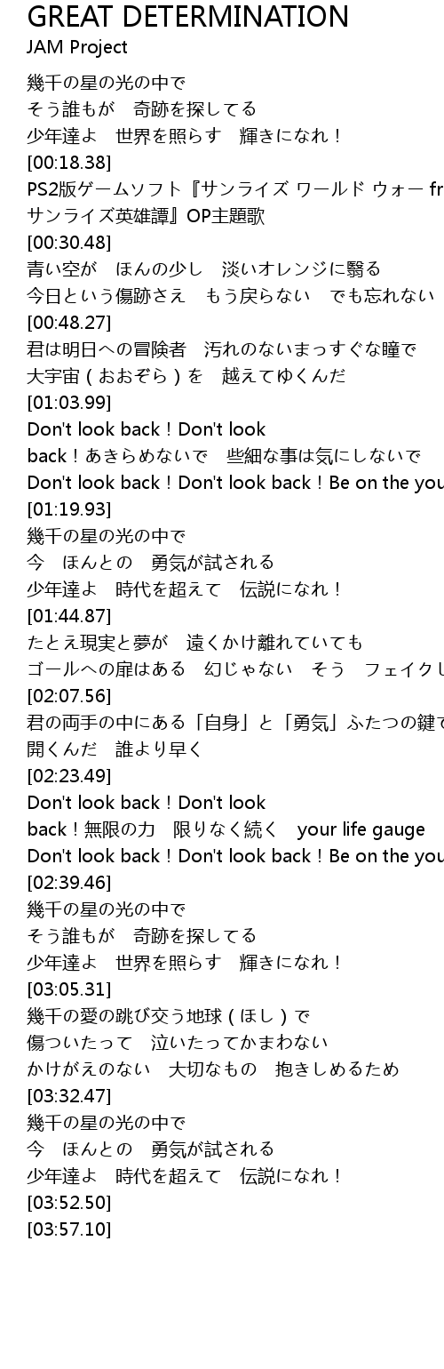 | [02:23.81] | Don't look back!Don't look back!無限の力 限りなく続く your life gauge |