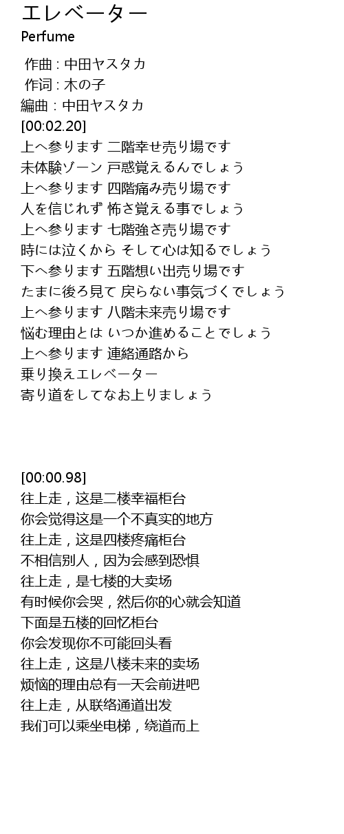 | [02:12.72] | 乗り換えエレベーター 寄り道をしてなお上りましょう |