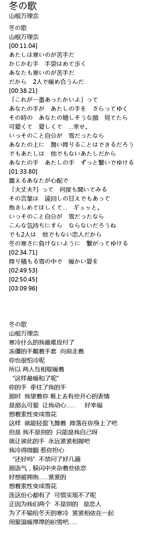 | [02:24.93] | 冬の寒さに負けないように 繋がってゆける |