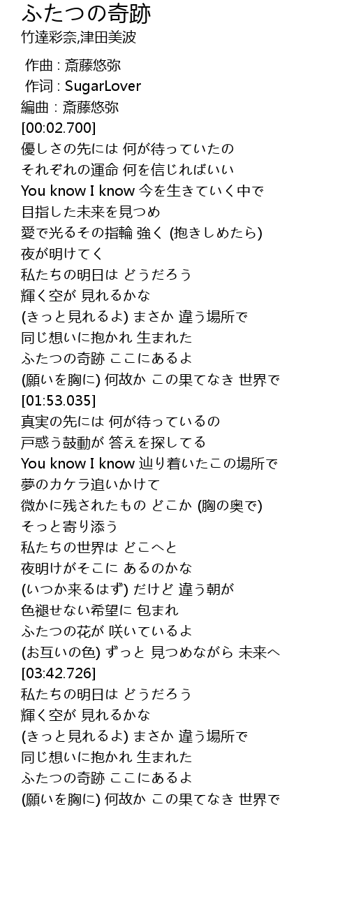 | [01:34.951] | ふたつの奇跡 ここにあるよ |