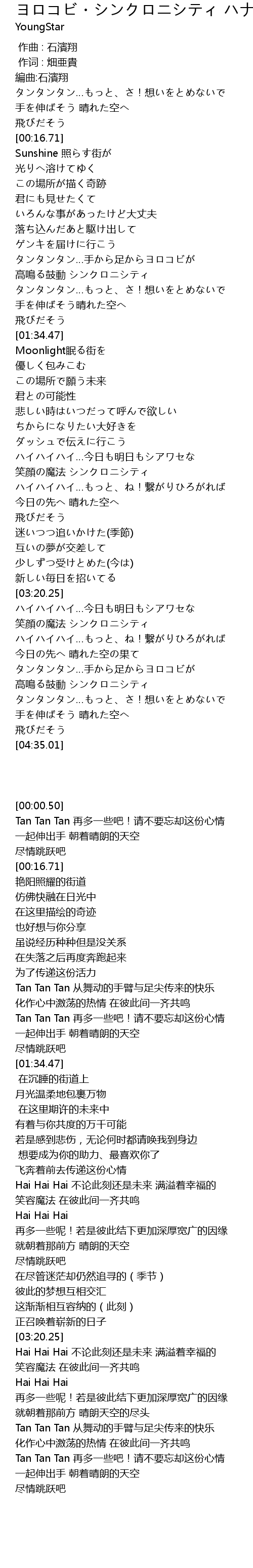 | [04:18.06] | Tan Tan Tan 再多一些吧!请不要忘却这份心情 |