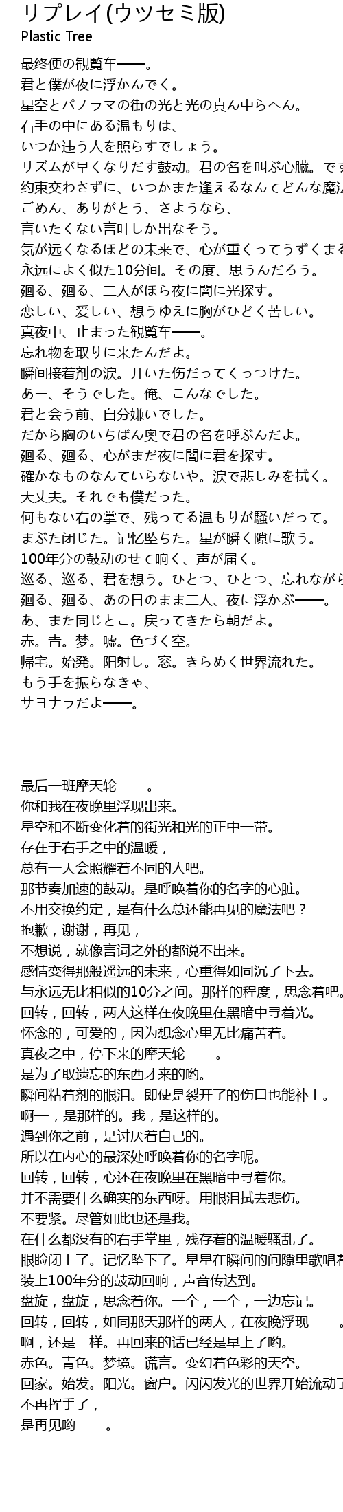 | [01:02.470] | 与永远无比相似的10分之间。那样的程度,思念着吧。 |