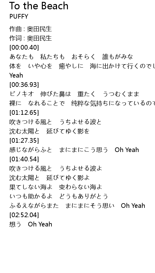 | [00:14.92] | 体を いや心を 癒やしに 海に出かけて行くのでしょうね Oh Yeah |