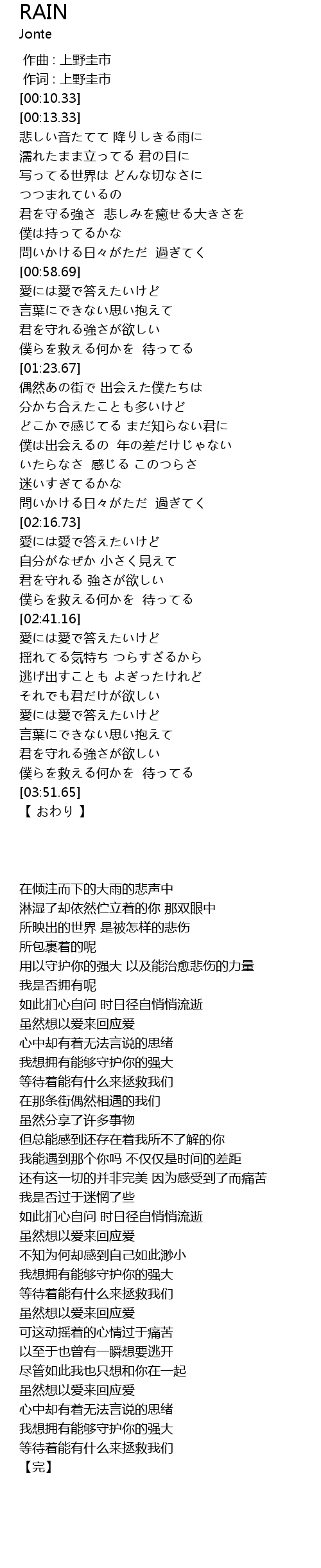 | [00:15.33] | 悲しい音たてて 降りしきる雨に |