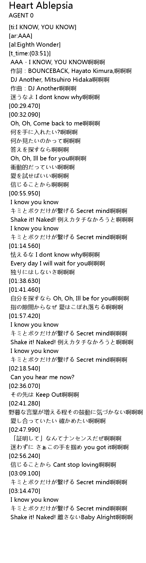 | [00:00.000] | AAA - I KNOW, YOU KNOW啊啊啊 |