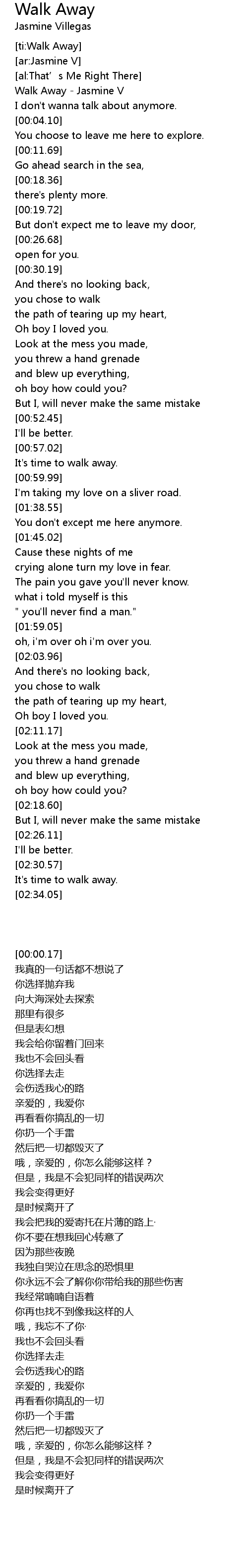 | [00:00.17] | Walk Away - Jasmine V |