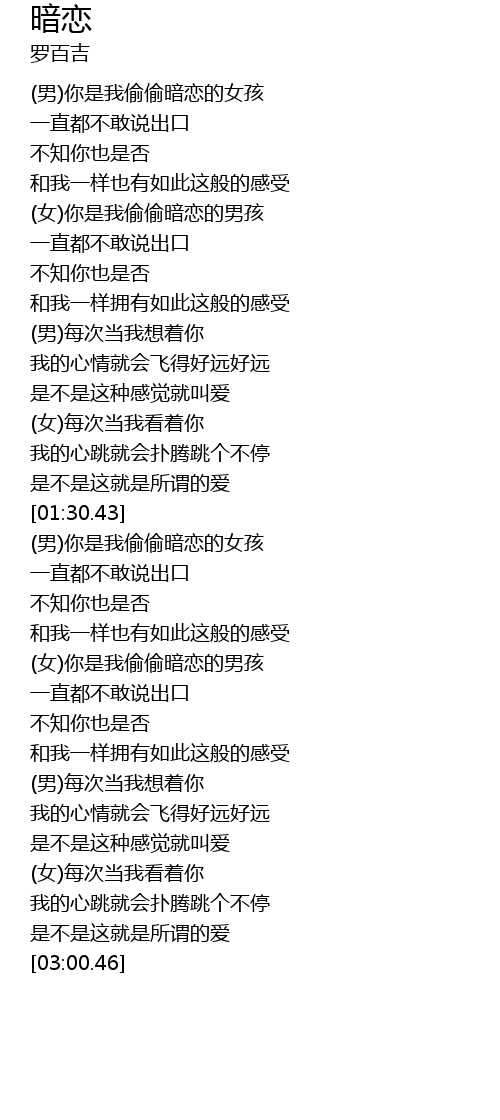 | [00:32.55] | (男)你是我偷偷暗恋的女孩 |