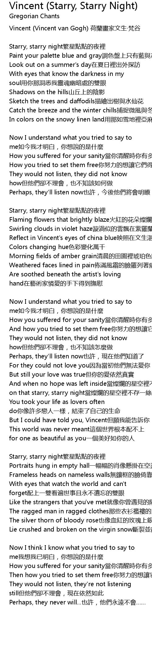 | But I could have told you, Vincent但願我能告訴你,文生 | |