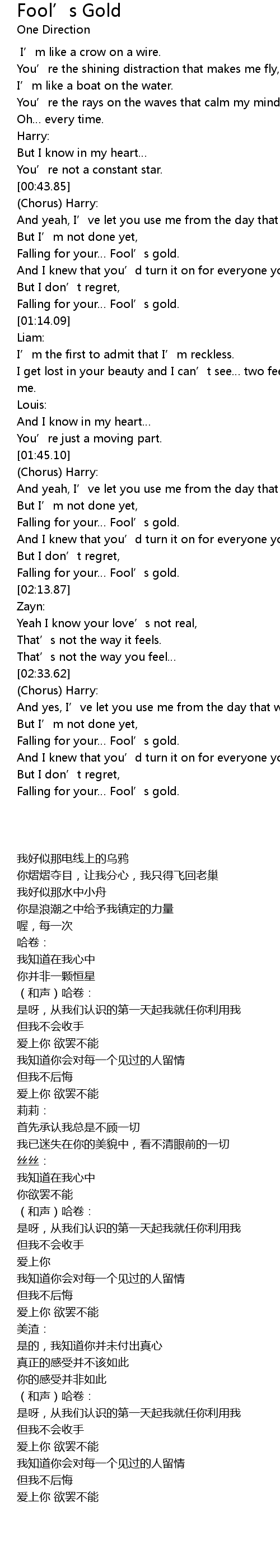 | [01:57.68] | Falling for your… Fool’s gold. |