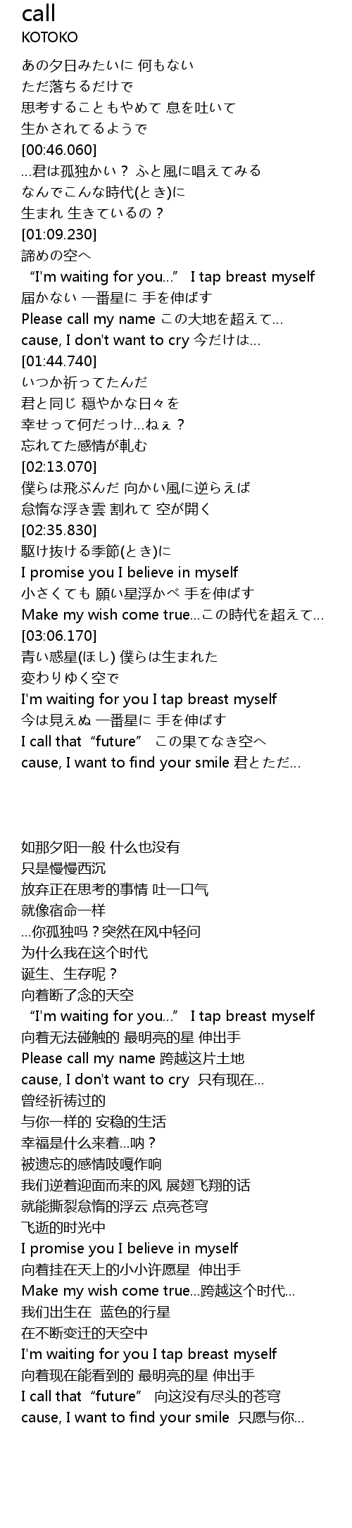 | [01:28.160] | Please call my name この大地を超えて… |