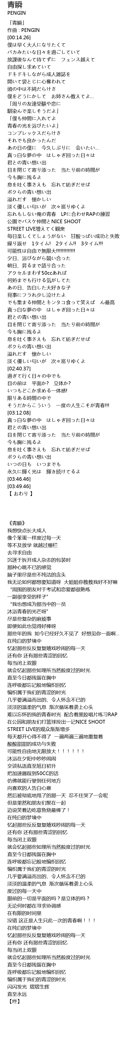 | [01:36.50] | 忘れもしない俺の青春 LPに合わせRAPの練習 |