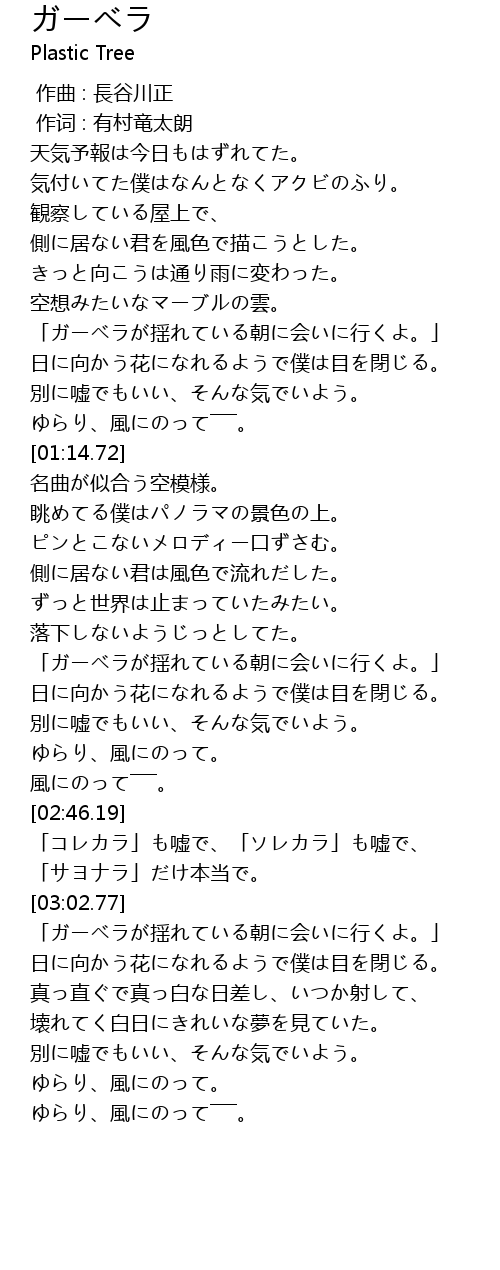 | [02:09.76] | 「ガーベラが揺れている朝に会いに行くよ。」 |