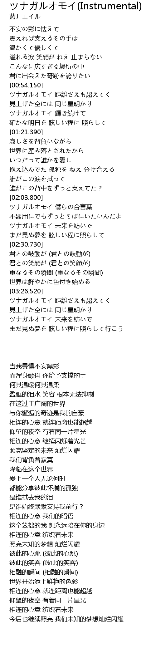 [00:56.700] ツナガルオモイ 距離さえも超えてく