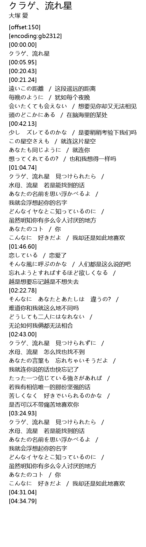 | [02:43.03] | クラゲ、流れ星 見つけられずに / 水母、流星 怎么找也找不到 |