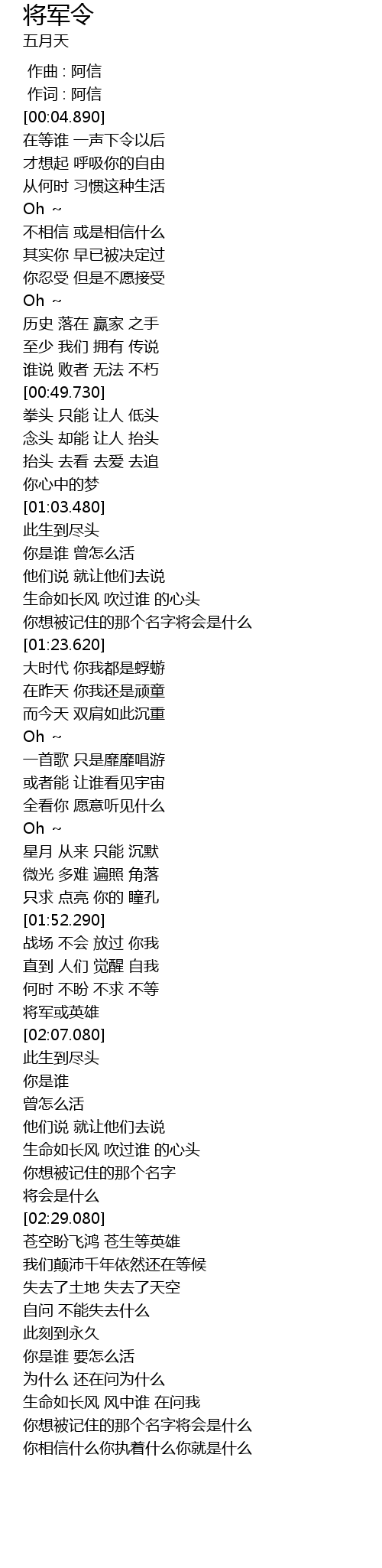 | [02:01.160] | jiāng jūn huò yīng xióng |