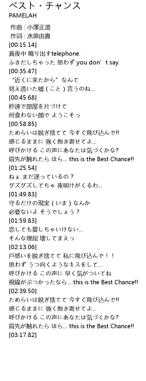 | [03:10.48] | 肩先が触れたら ほら... this is the Best Chance!! |