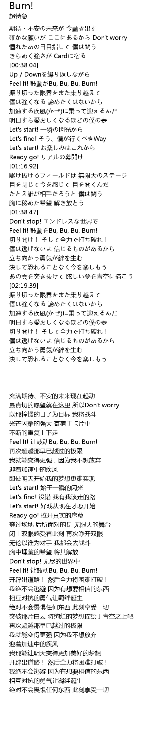 | [00:41.72] | Feel It! gǔ dòng Bu, Bu, Bu, Burn! |