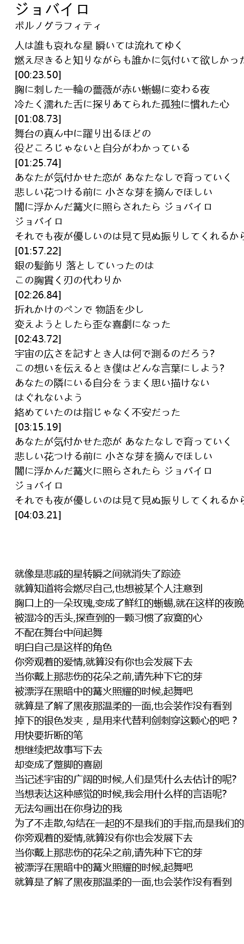 | [03:46.79] | 闇に浮かんだ篝火に照らされたら ジョバイロ ジョバイロ |