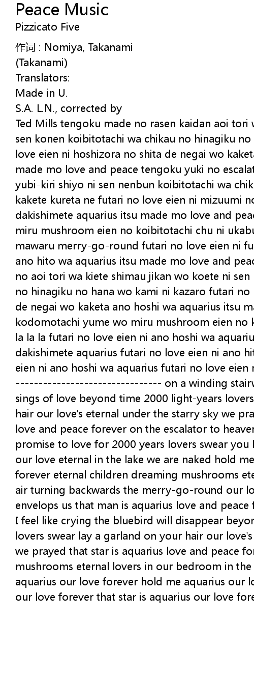 | Ted Mills tengoku made no rasen kaidan aoi tori wa ai wo utau jikan wo koete ni sen konen koibitotachi wa chikau no hinagiku no hana wo kami ni kazaro futari no love eien ni hoshizora no shita de negai wo kaketa ano hoshi wa aquarius itsu made mo love and peace tengoku yuki no escalator aoi tori wo oikakeru no yubi-kiri shiyo ni sen nenbun koibitotachi wa chikau no beads no kubikazari kakete kureta ne futari no love eien ni mizuumi no naka de hadaka ni natte dakishimete aquarius itsu made mo love and peace eien no kodomotachi yume wo miru mushroom eien no koibitotachi chu ni ukabu bedroom la la la la sakasama ni mawaru merry-go-round futari no love eien ni fushigi na kaori ni tsutsumareteru ano hito wa aquarius itsu made mo love and peace yume kara samete nakitakunaru no aoi tori wa kiete shimau jikan wo koete ni sen konen koibitotachi wa chikau no hinagiku no hana wo kami ni kazaro futari no love eien ni hoshizora no shita de negai wo kaketa ano hoshi wa aquarius itsu made mo love and peace eien no kodomotachi yume wo miru mushroom eien no koibitotachi chu ni ukabu bedroom la la la la futari no love eien ni ano hoshi wa aquarius futari no love eien ni dakishimete aquarius futari no love eien ni ano hito wa aquarius futari no love eien ni ano hoshi wa aquarius futari no love eien ni dakishimete aquarius -------------------------------- on a winding stairway to heaven the bluebird sings of love beyond time 2000 light-years lovers swear lay a garland on your hair our love's eternal under the starry sky we prayed that star is aquarius love and peace forever on the escalator to heaven chasing the bluebird let's promise to love for 2000 years lovers swear you lay a bead necklace around me our love eternal in the lake we are naked hold me, aquarius love and peace forever eternal children dreaming mushrooms eternal lovers in our bedroom in the air turning backwards the merry-go-round our love forever a mysterious fragrance envelops us that man is aquarius love and peace forever awakin' from a dream | |