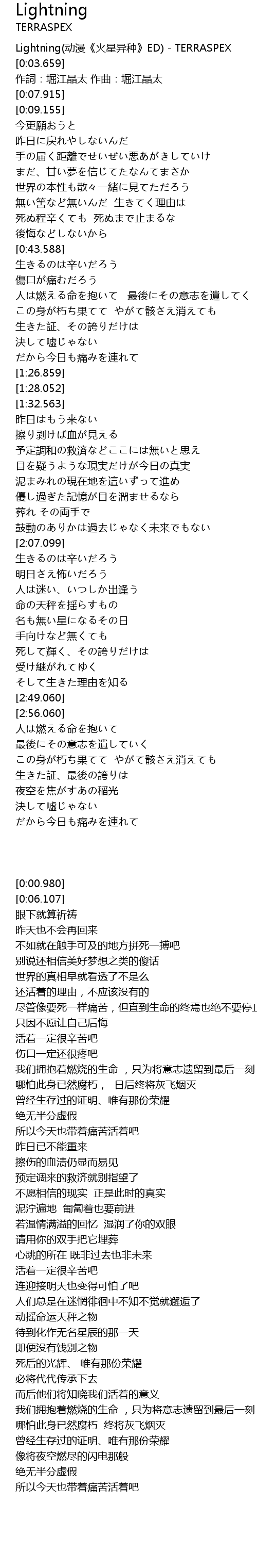 | [0:00.980] | Lightning(动漫《火星异种》ED) - TERRASPEX |