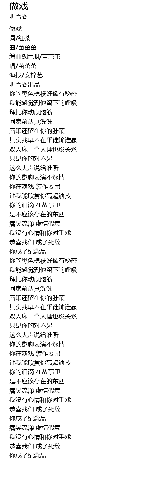 | [00:53.640] | 你在演戏 装作委屈 |