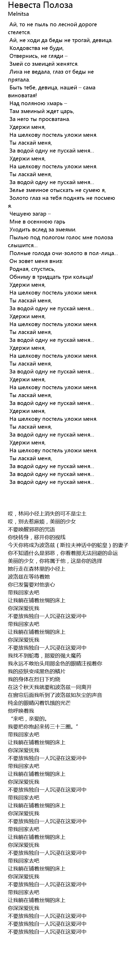 | [00:38.253] | 今天你将成为波洛兹(斯拉夫神话中的蛇皇)的妻子 |