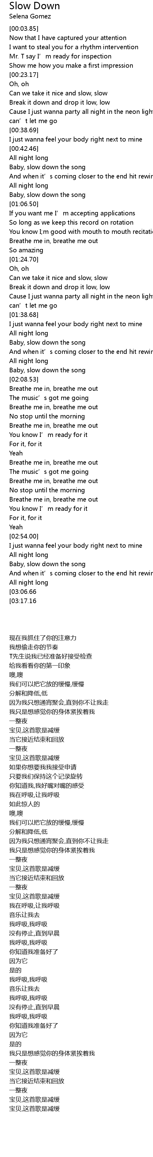 | [03:21.25][03:06.66] | Baby, slow down the song |