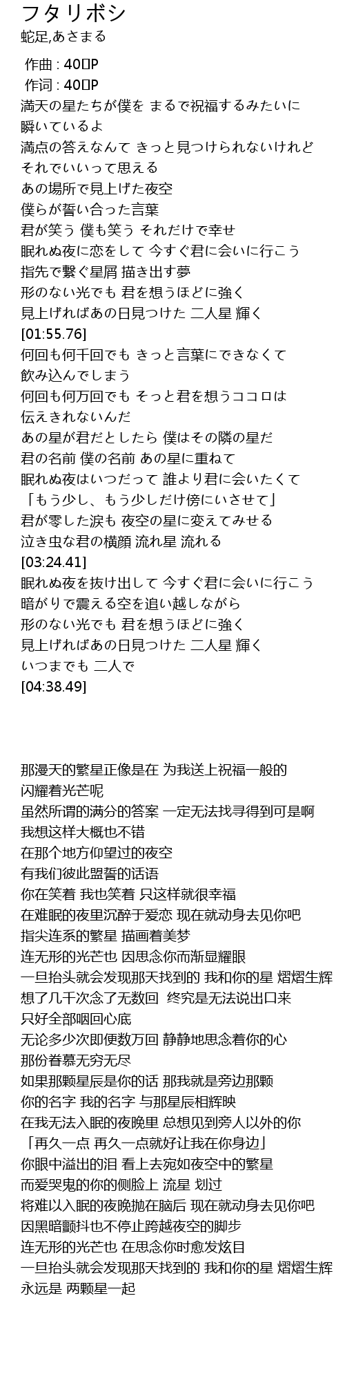 | [02:38.22] | 君の名前 僕の名前 あの星に重ねて |