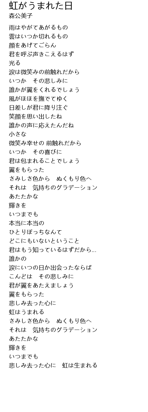 | [01:56.50] | 悲しみ去った心に 虹は生まれる |