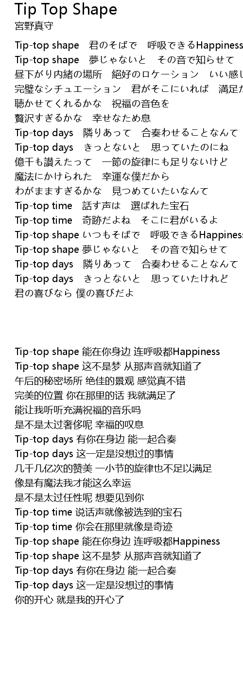 | [00:05.490] | Tip-top shape 君のそばで 呼吸できるHappiness |