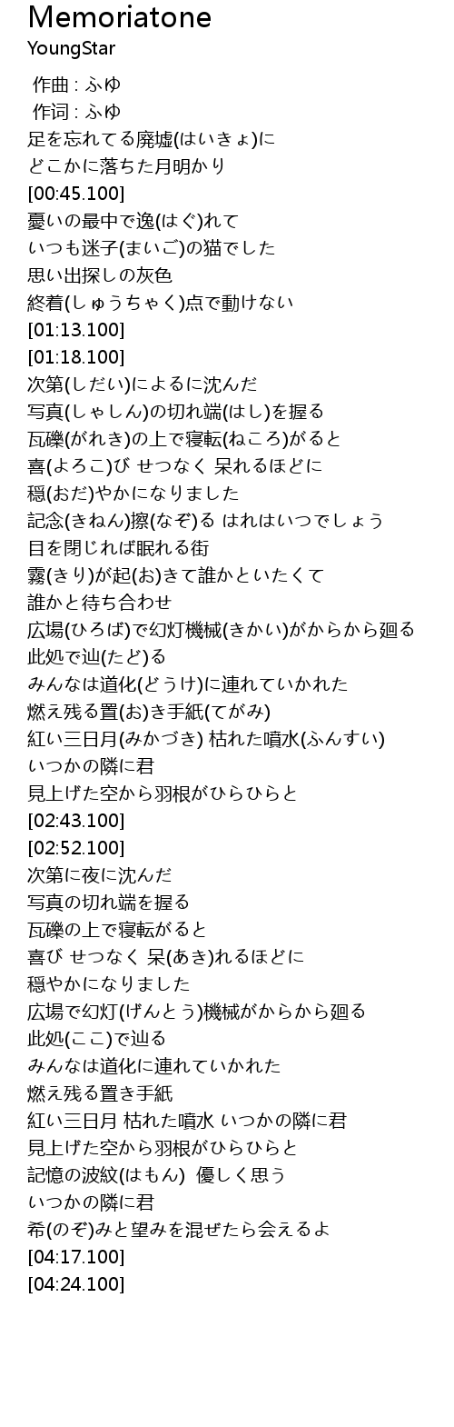 | [03:39.100] | 紅い三日月 枯れた噴水 いつかの隣に君 |